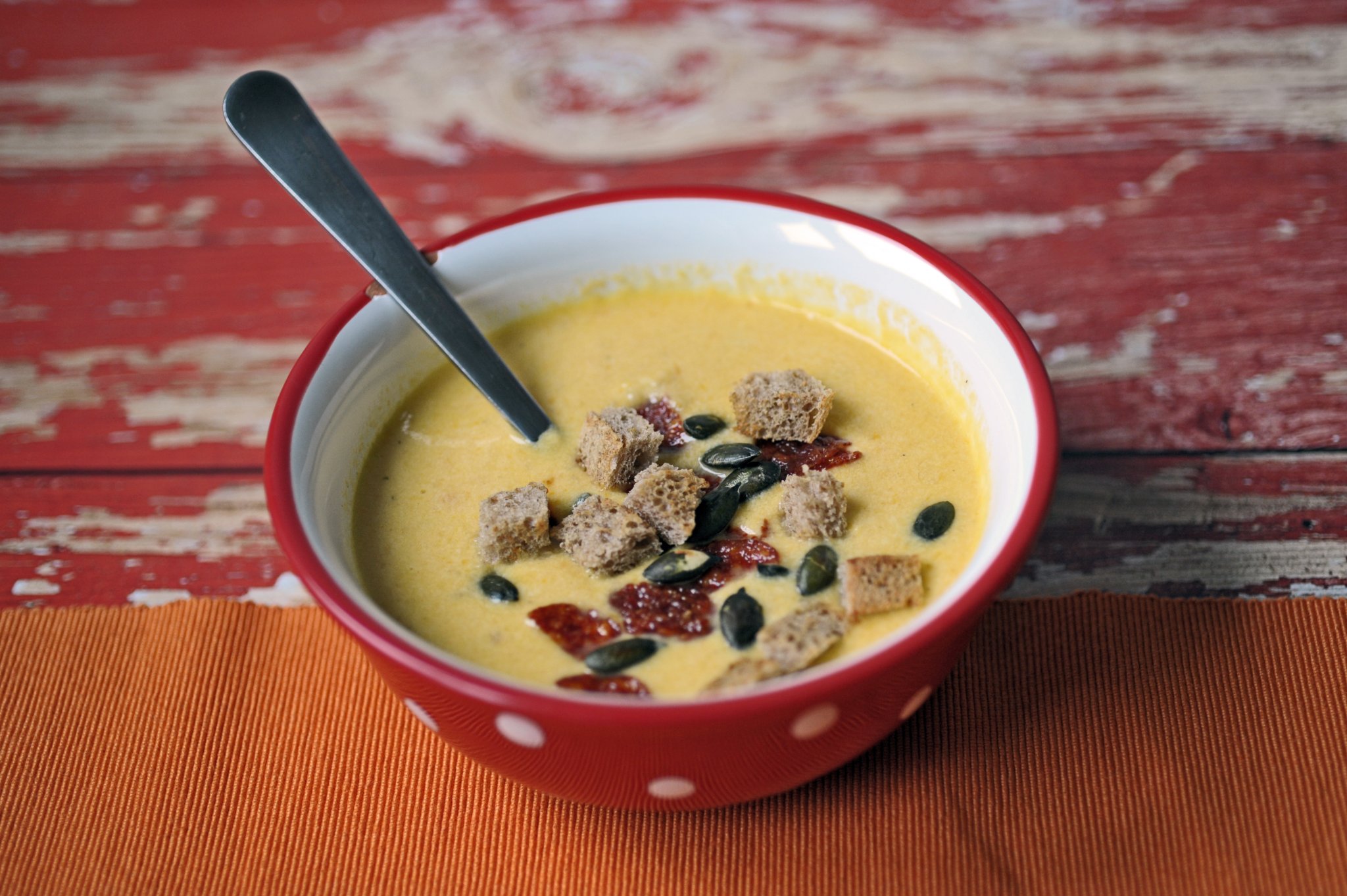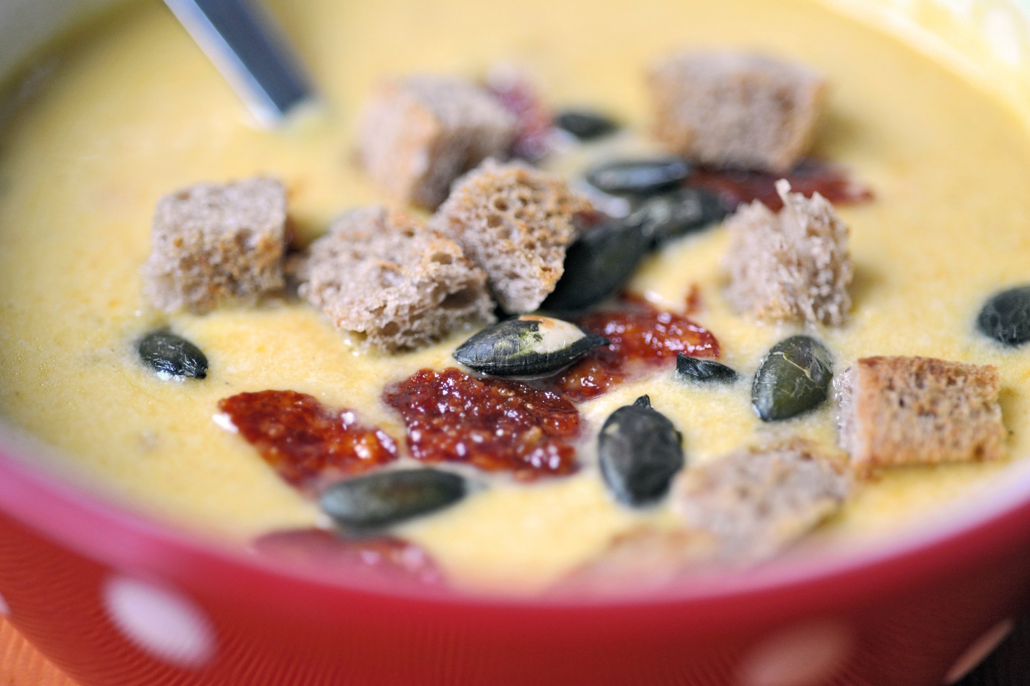 Közvetlenül tálalás előtt hintsd rá a tökmagot, kolbász chipset , és a kenyérkockákat. Tudom, hogy imádni fogod 🙂 .