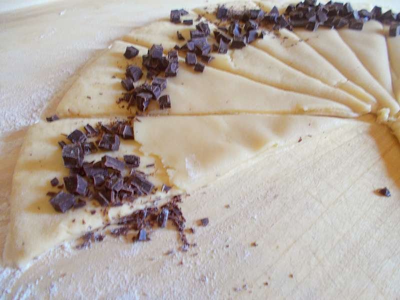 Amikor szépen megkelt a tésztád, lisztezett deszkán nyújtsd ki 30-35 cm nagyságú körré, fél cm vastagsággal. A belsejére illeszd rá a marcipán körödet, a szélére szórd a csokit, majd vágd fel 16 háromszögre. Mondanám, hogy egyformára, de minek ennyi megkötés, nekem sem az sosem :).